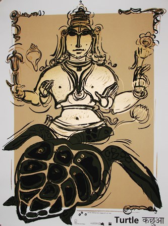 Turtle_Kachua Serigraph by Jatin Das(Unsigned)Jatin Das was contacted with the proposal and invited to Dakshin Foundation’s field station in Odisha to witness the mass nesting of Olive Ridley turtles, a grand phenomenon also known as an arribada (Spanish for ‘arrival’). Of the seven surviving species of sea turtles, only two species of Ridleys (Olive and Kemp’s) nest simultaneously in large numbers on specific beaches. Jatin Das himself was born in Odisha. On witnessing this unique event in 2010, he created the serigraph depicting the Olive Ridley as the ‘Kurma’ avatar of Vishnu.